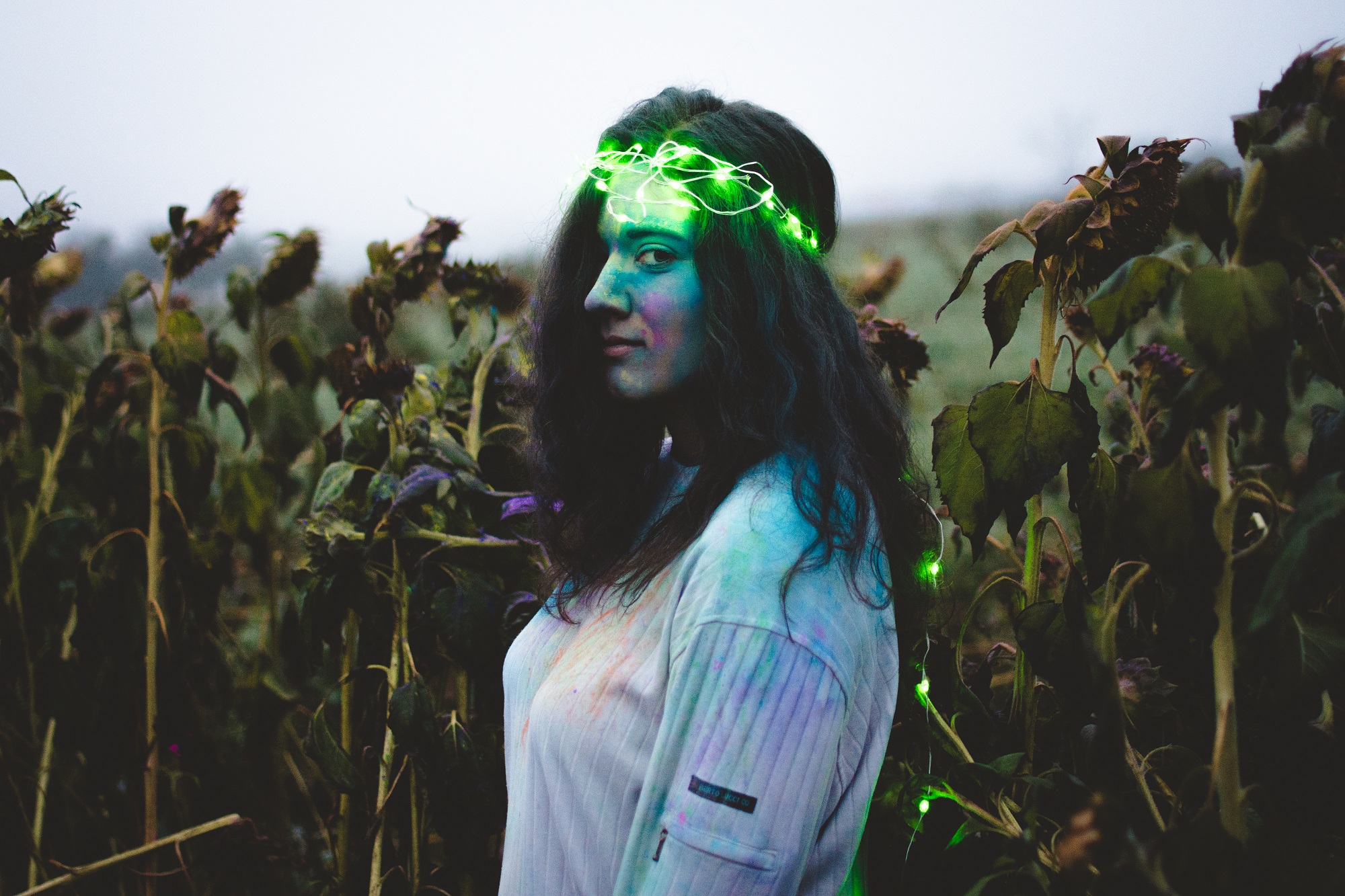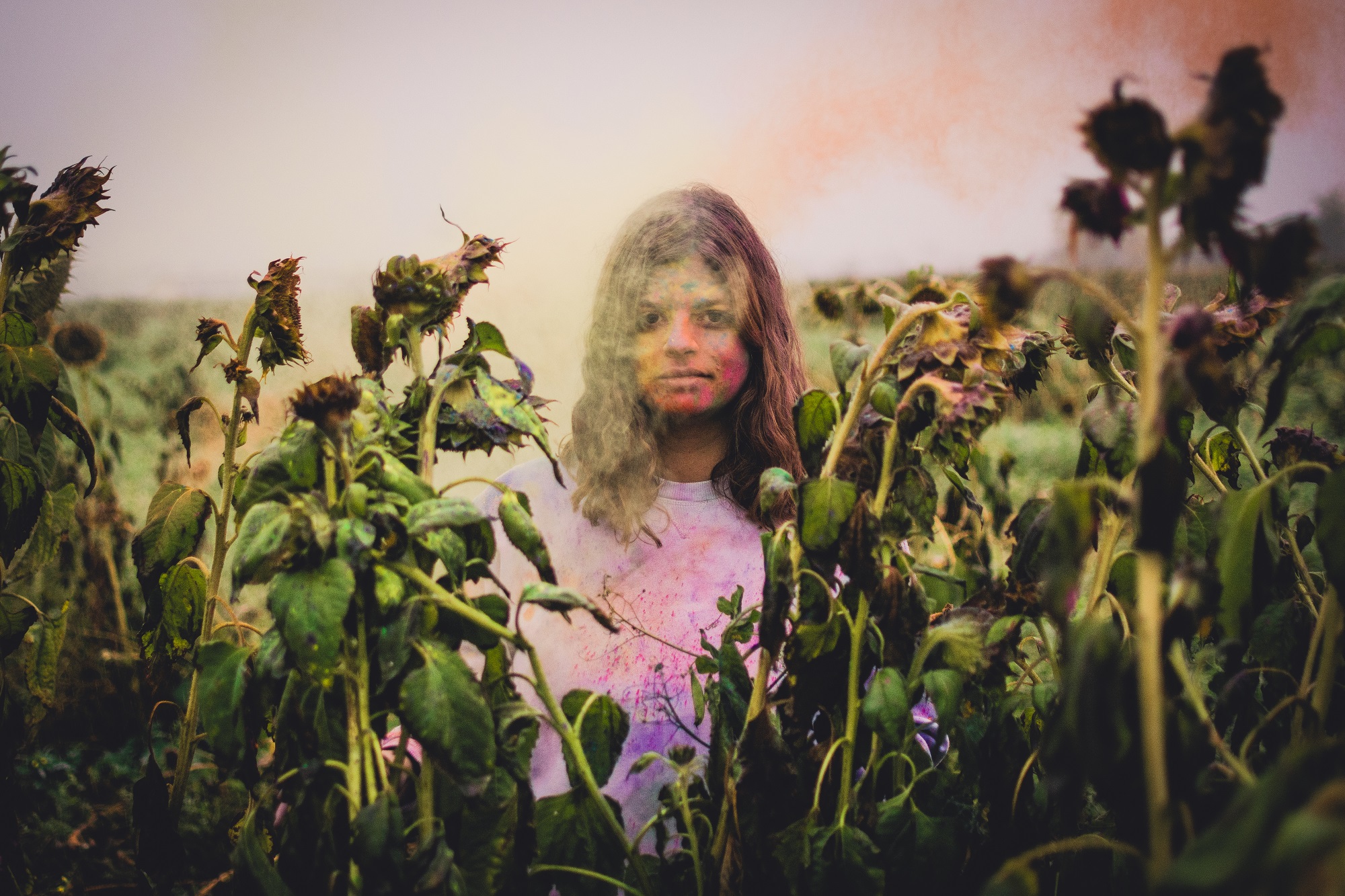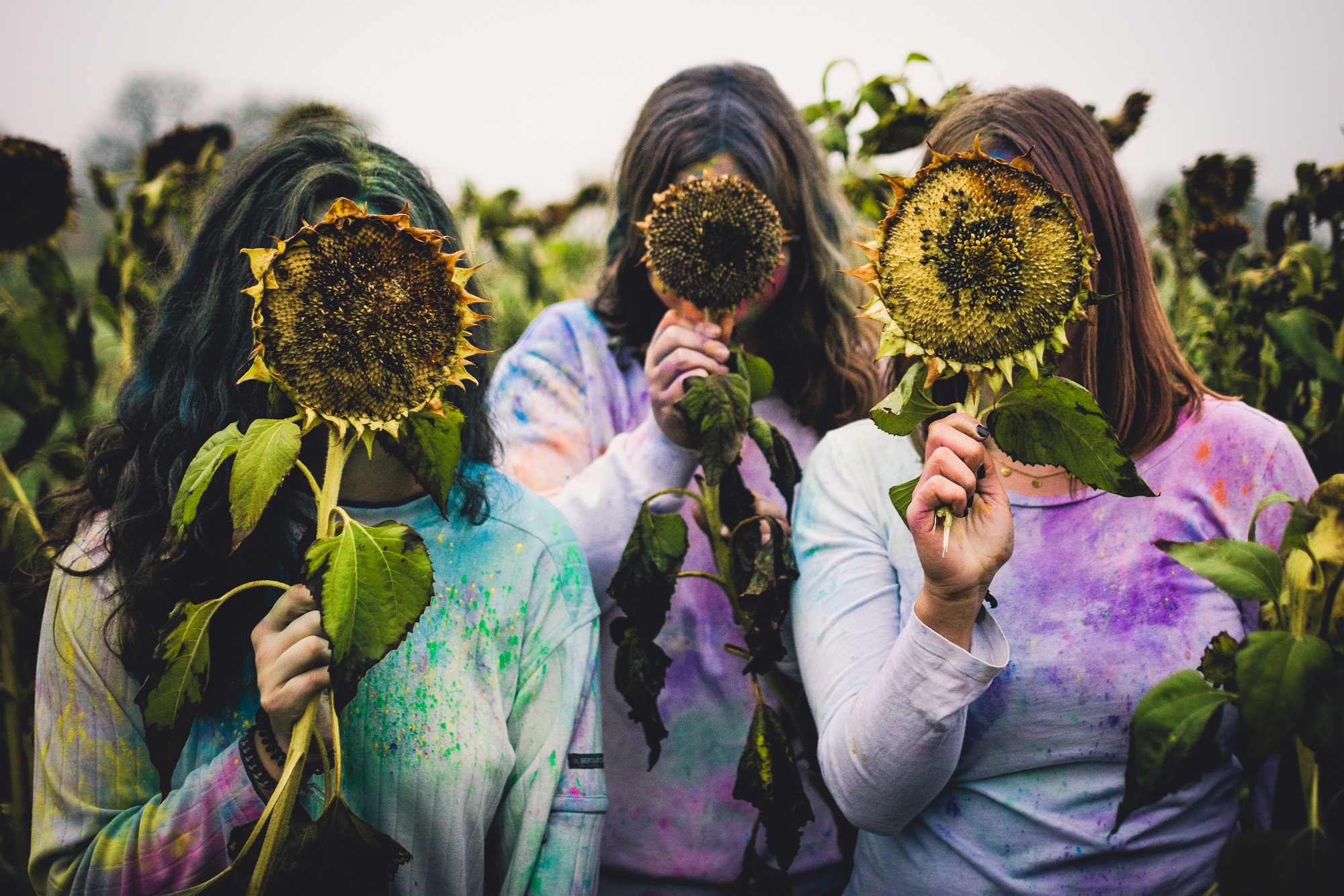 Nachdem die erste Location ausgedient hatte, ging es in ein benachbartes Sonnenblumenfeld. Oder das was davon übrig war. Zum nasskalten Wetter kamen nämlich nun auch noch völlig erschöpfte Übrigbleibsel der einst so leuchtenden Pflanzen dazu. Ich hätte mir keine trostlosere Umgebung malen können. Und die Damen machten eine verdammt gute Figur in ihren jeweiligen Outfits.